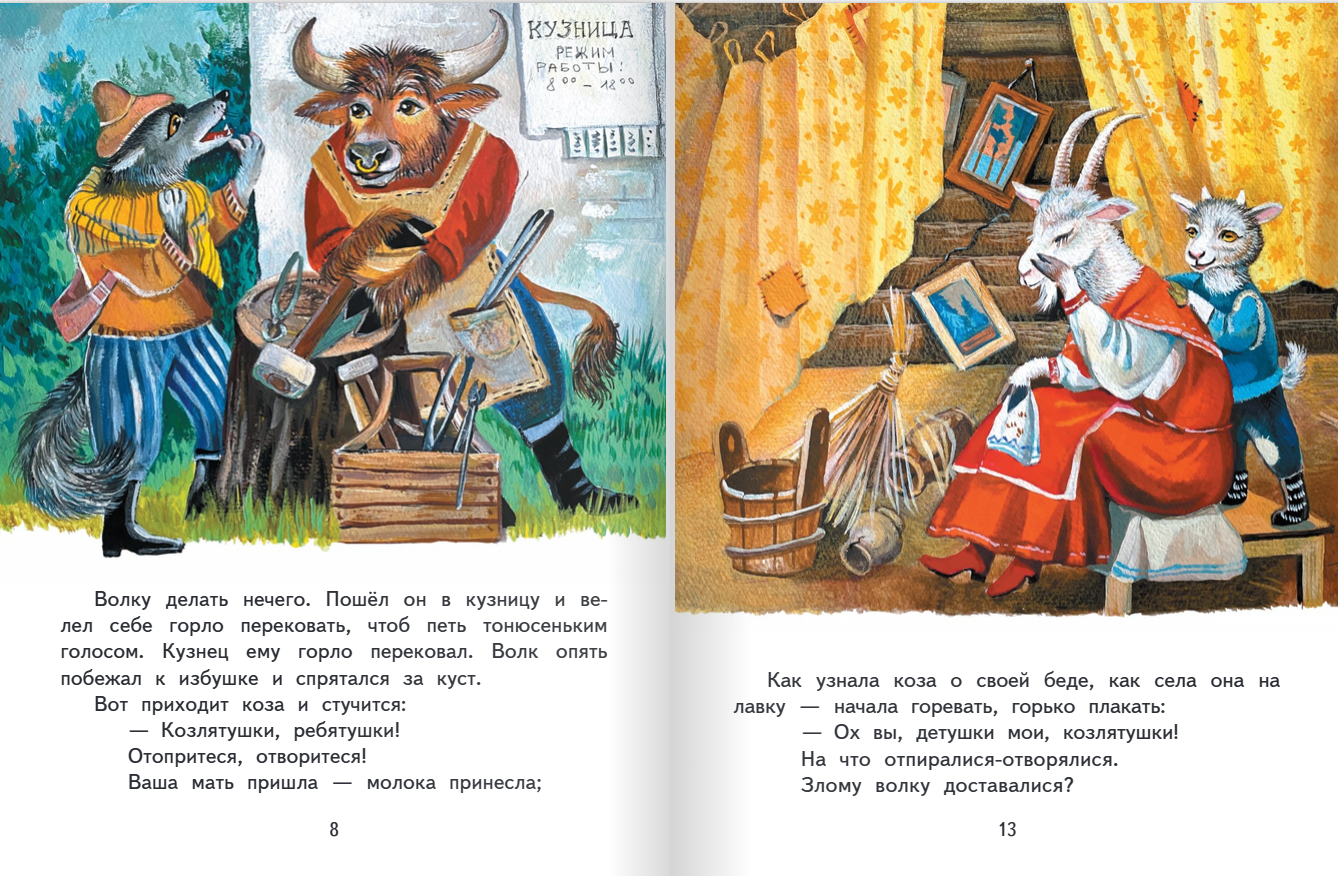 Перед вами книжка-игрушка из серии «Сказка на ладошке», которая предназначена дошкольникам – даже ещё не читателям, а слушателям. Прочтите сказку «Волк и козлята» ребёнку вслух и рассмотрите иллюстрации. В середине книжки вы найдёте лист с выкройками сказочных героев. Вместе с ребёнком аккуратно отогните скрепки, извлеките лист и вырежьте ножницами фигурки с основой-подставкой. Затем согните их по пунктирным линиям и склейте переднюю и заднюю части. Теперь с помощью забавных героев ваш ребёнок сможет разыграть только что прочитанную сказку или придумать своё продолжение сказочной истории.