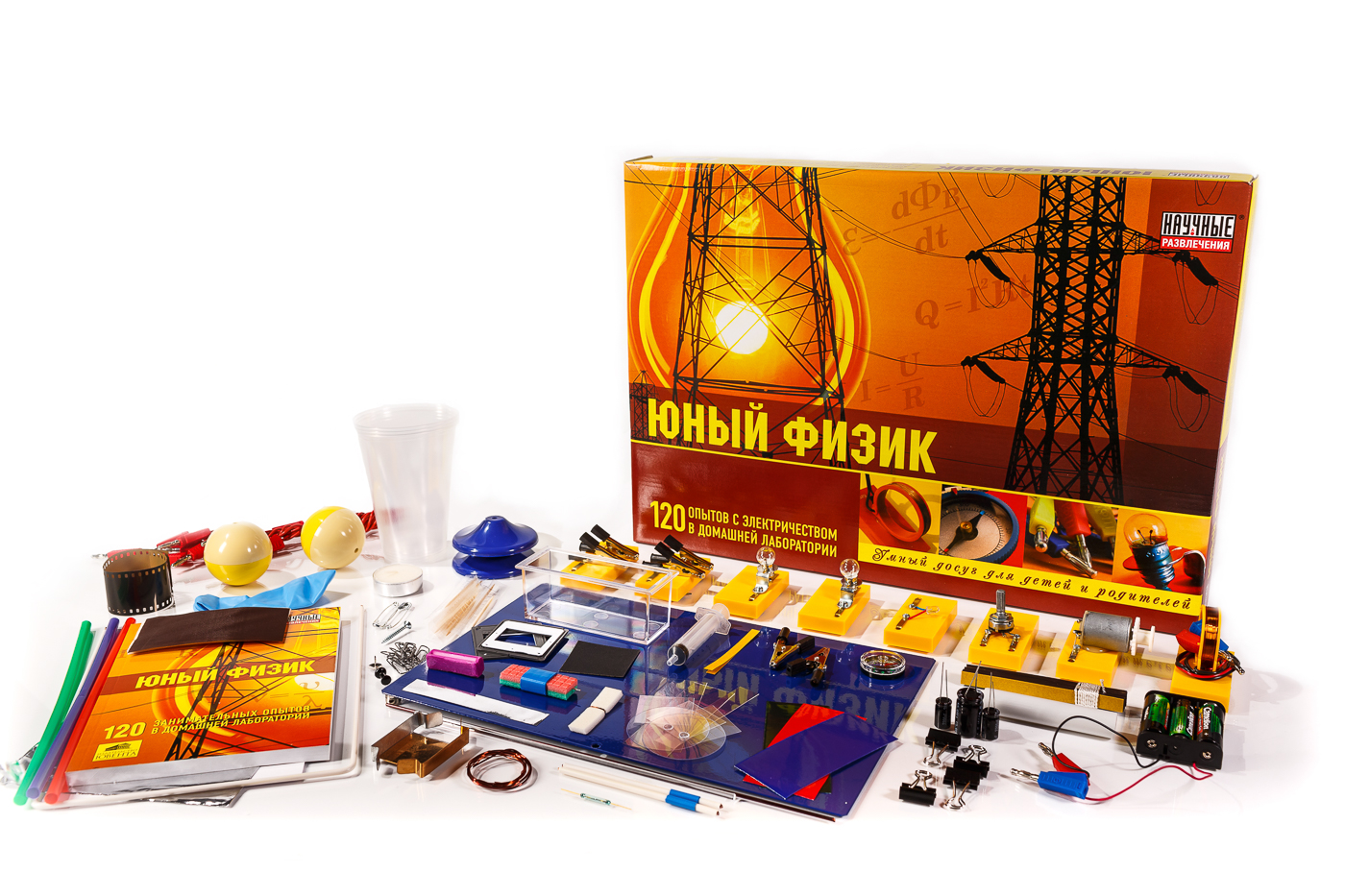 Юный физик получит навыки построения электрических цепей, проведет опыты с резисторами, конденсаторами и диодами, узнает о свойствах жидкостей, познакомится с теорией строения вещества, проведет необычные эксперименты со светофильтрами, батарейками и  моторчиком.