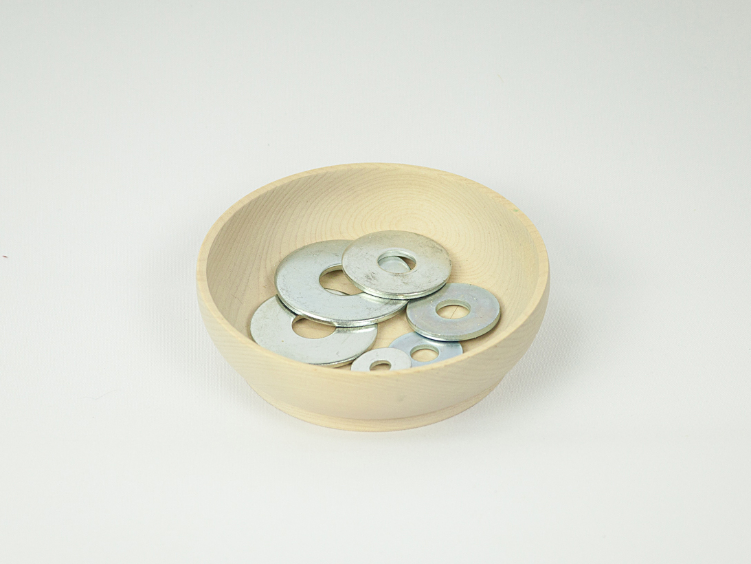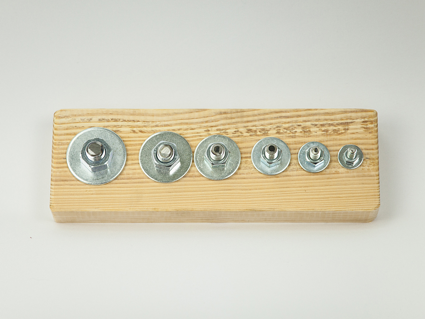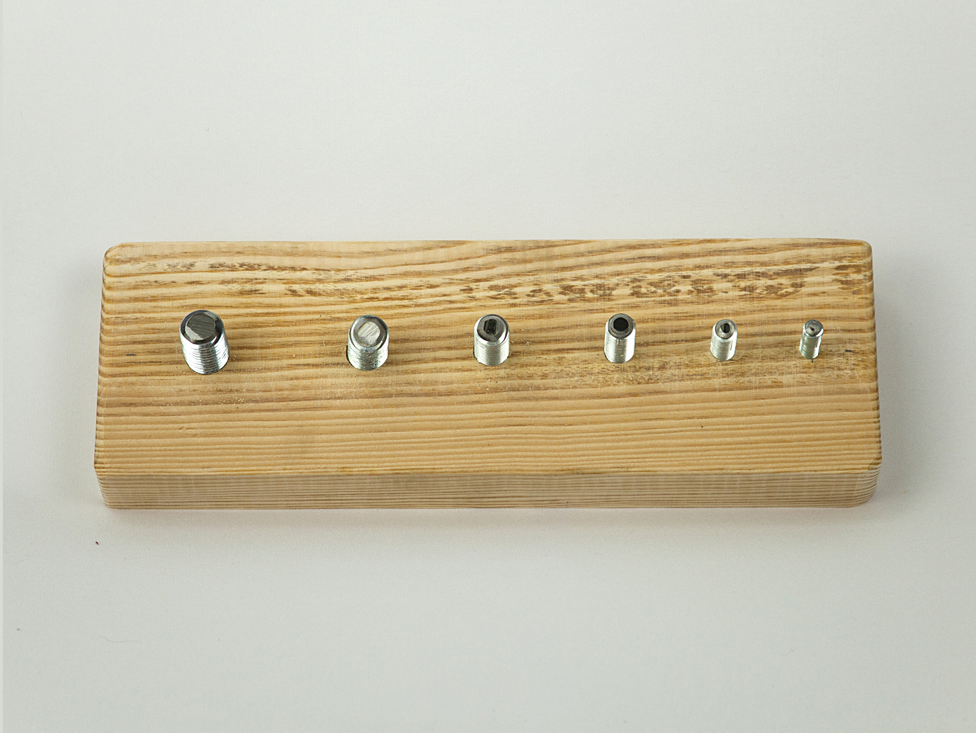 1. Основа - доска 30х10 см. В нее вставлены шпильки диаметров 8,10, 12, 14 и 16 мм. Высота шпилек 2,5 см.