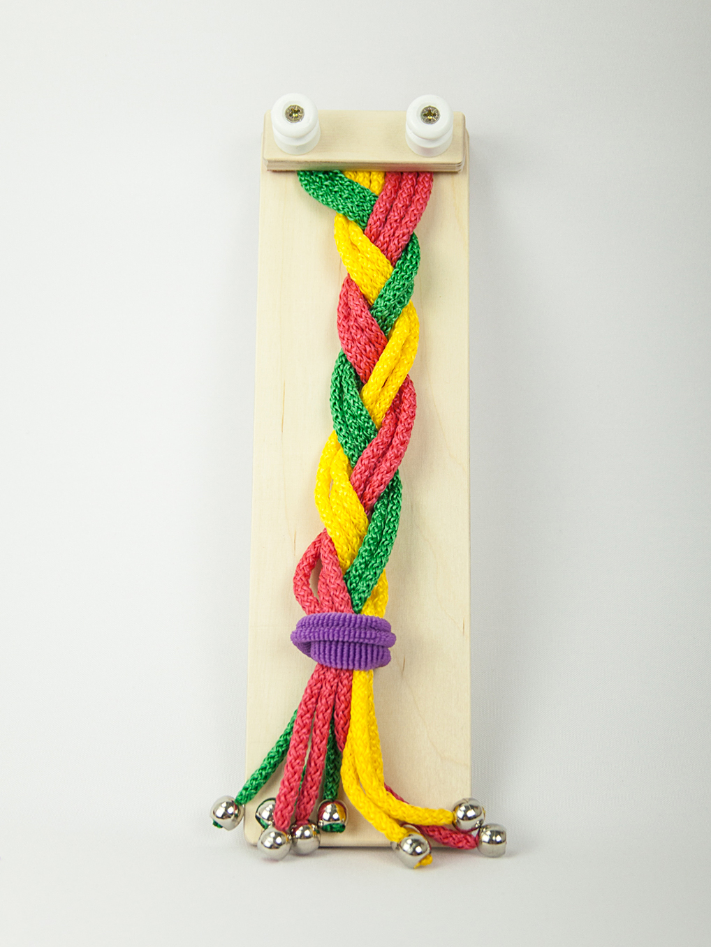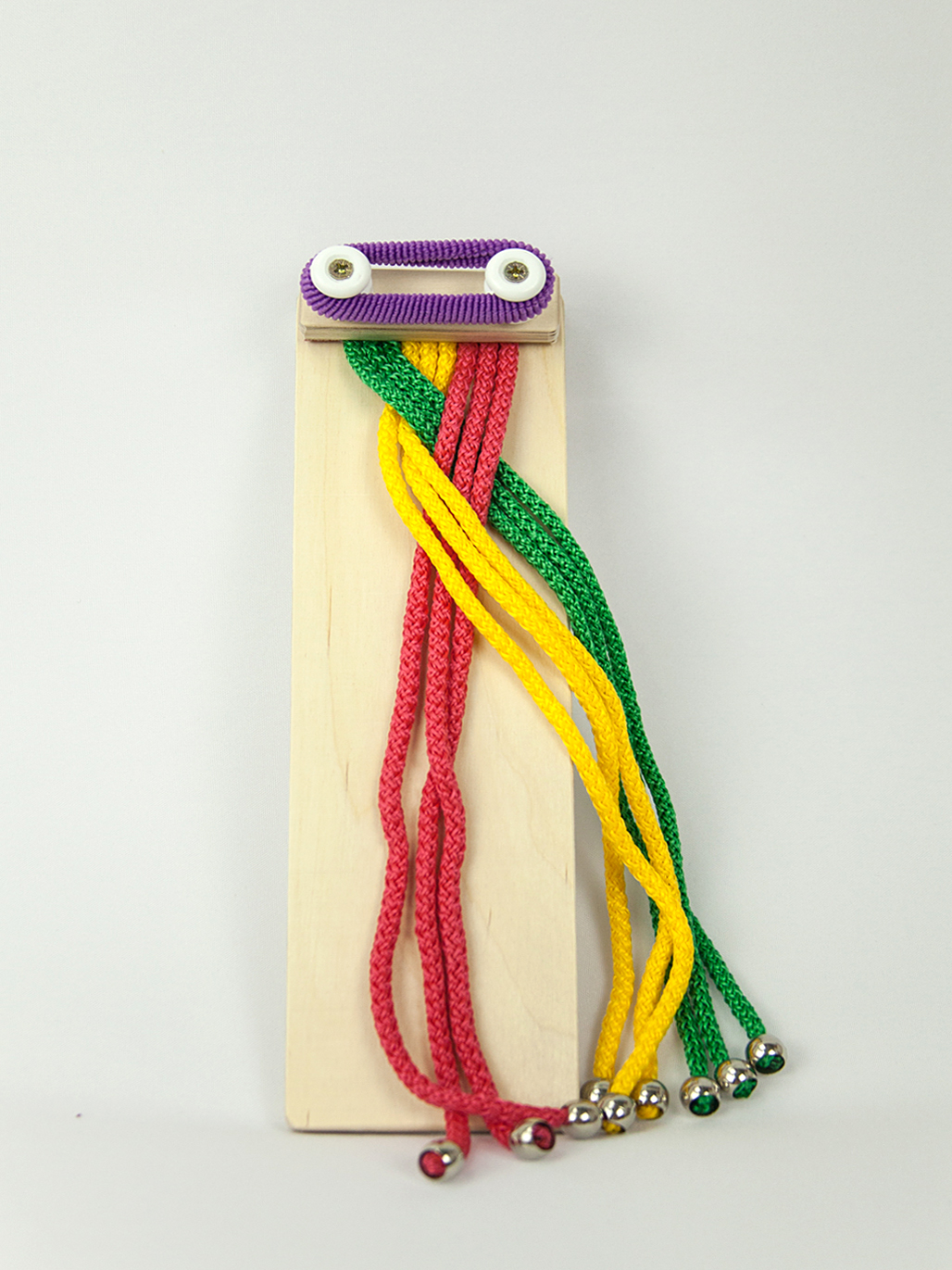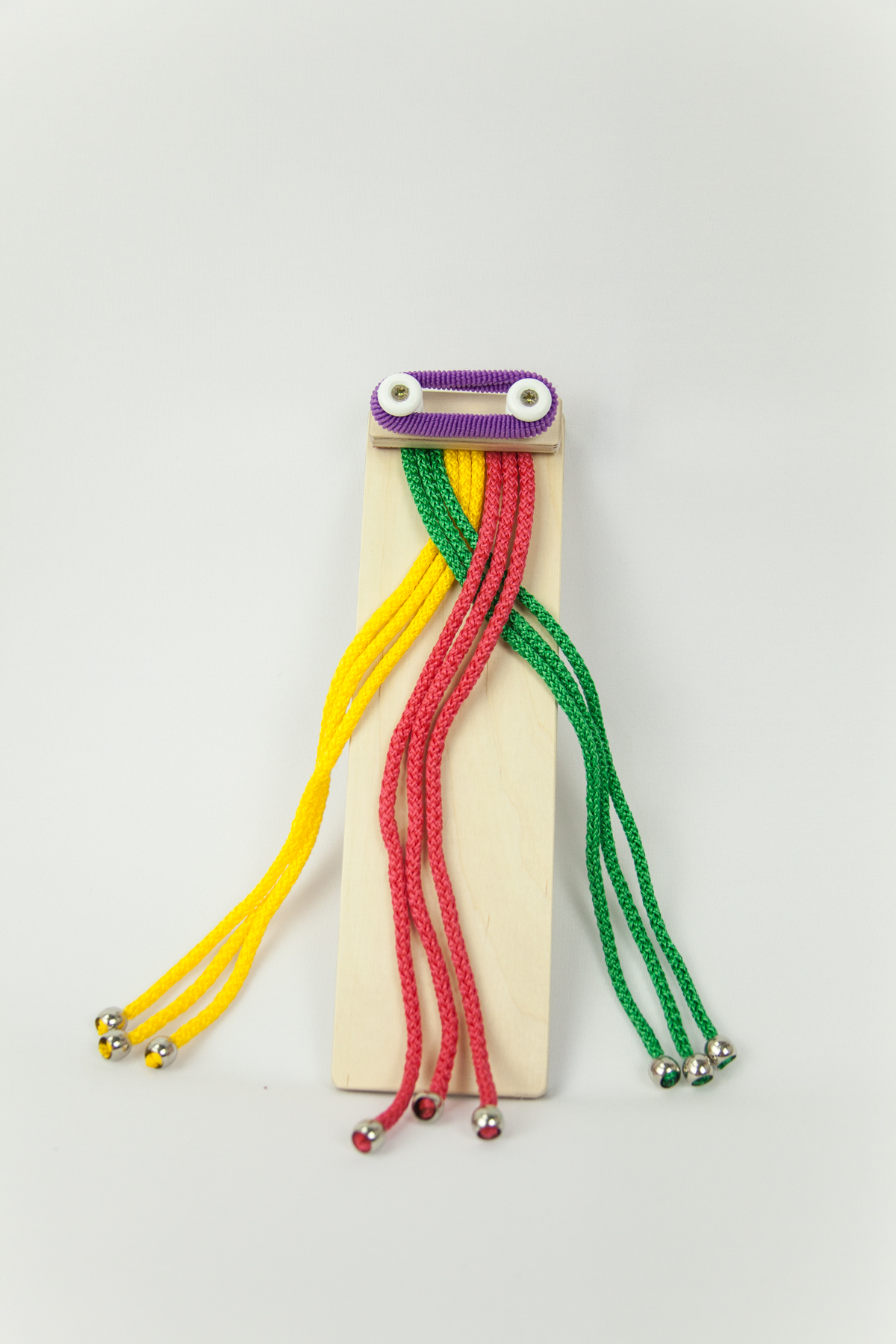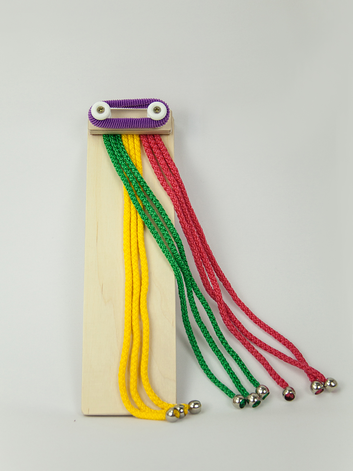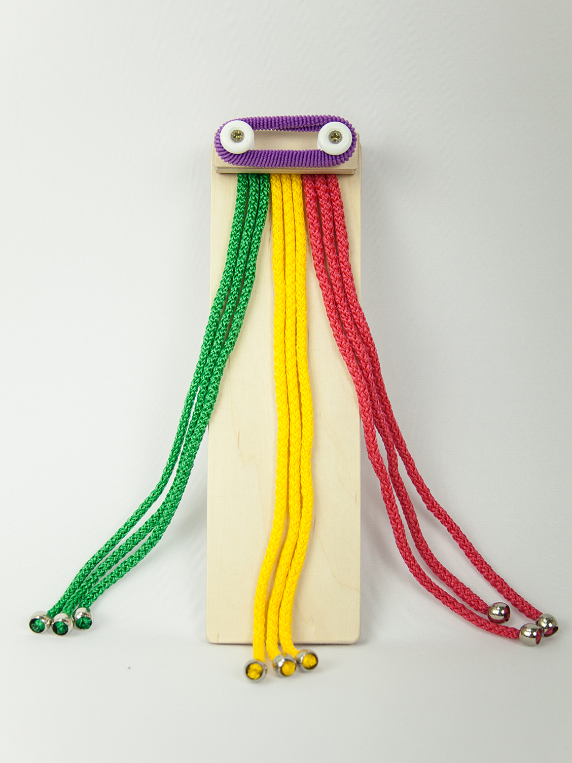 1. Основа – доска 10х30 см. К ней прикреплены 9 шнуров из полиэстера 3-х разных цветов. Длина шнура 30 см. Диаметр – 6 мм. На конце шнура – пластиковая бусина.