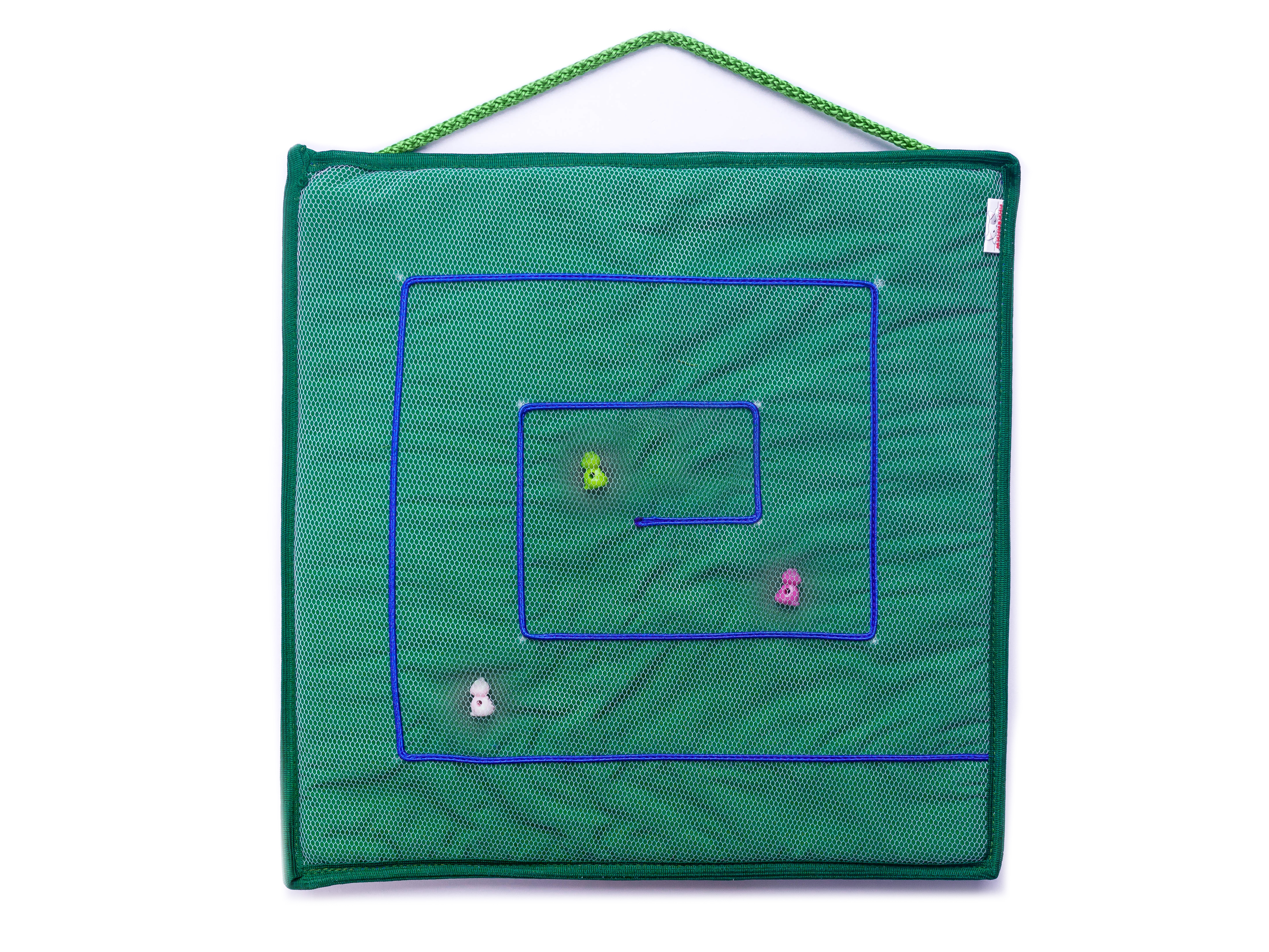 Комплектация: на  квадрате размещен лабиринт с помощью тесьмы и сетки, под сеткой - 3 пуговки разного цвета. Размер: 30х30 см.