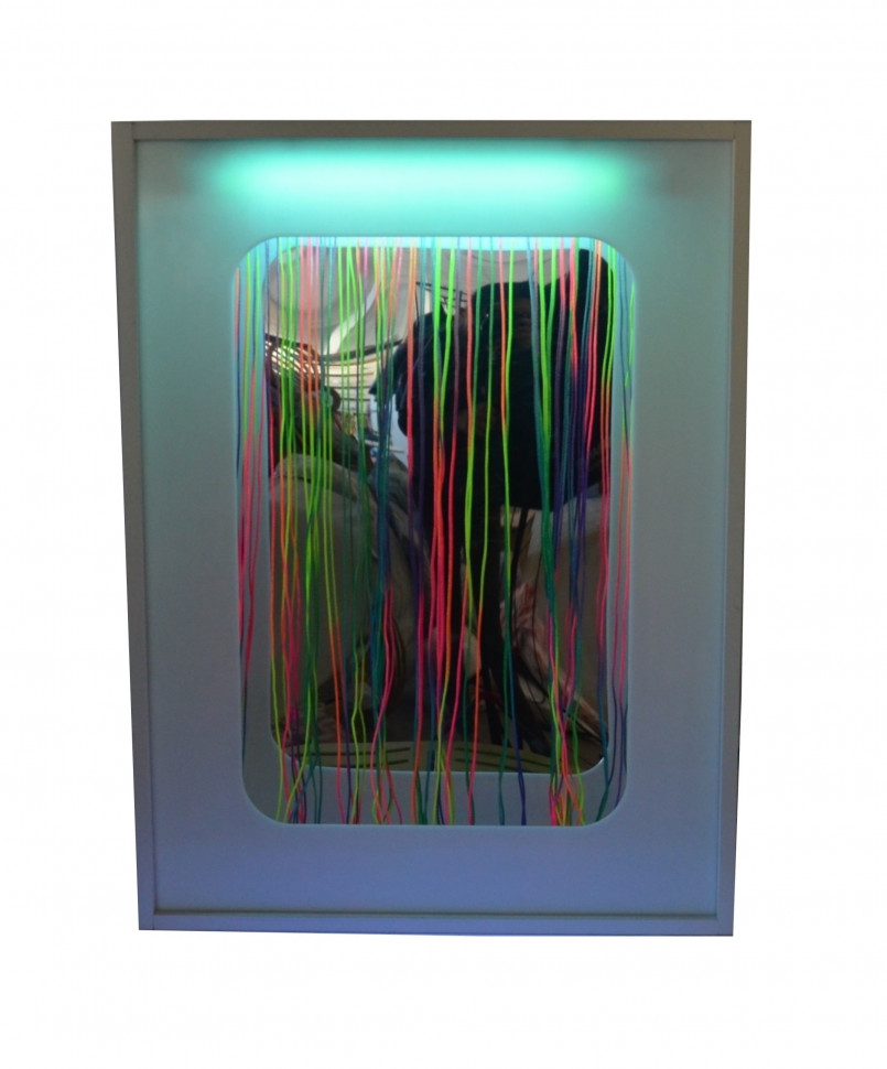 Настенное панно со светящимися в ультрафиолете нитями моментально приковывает к себе внимание, дарит необычные тактильные ощущения и стимулирует зрение. Нити светятся в темноте по всей длине, цвет каждого меняется на всем протяжении. Ультрафиолетовый свет для человеческого глаза невидим и полностью безопасен. Нити и ультрафиолетовая лампа установлены в короб с акриловым зеркалом на задней части для усиления эффекта, нити можно и нужно трогать и перебирать руками. Размер : 60х90х12 см Материал : МДФ, акриловое зеркало, матовое орг стекло, ультрафиолетовая лампа, флуоресцентные нити.