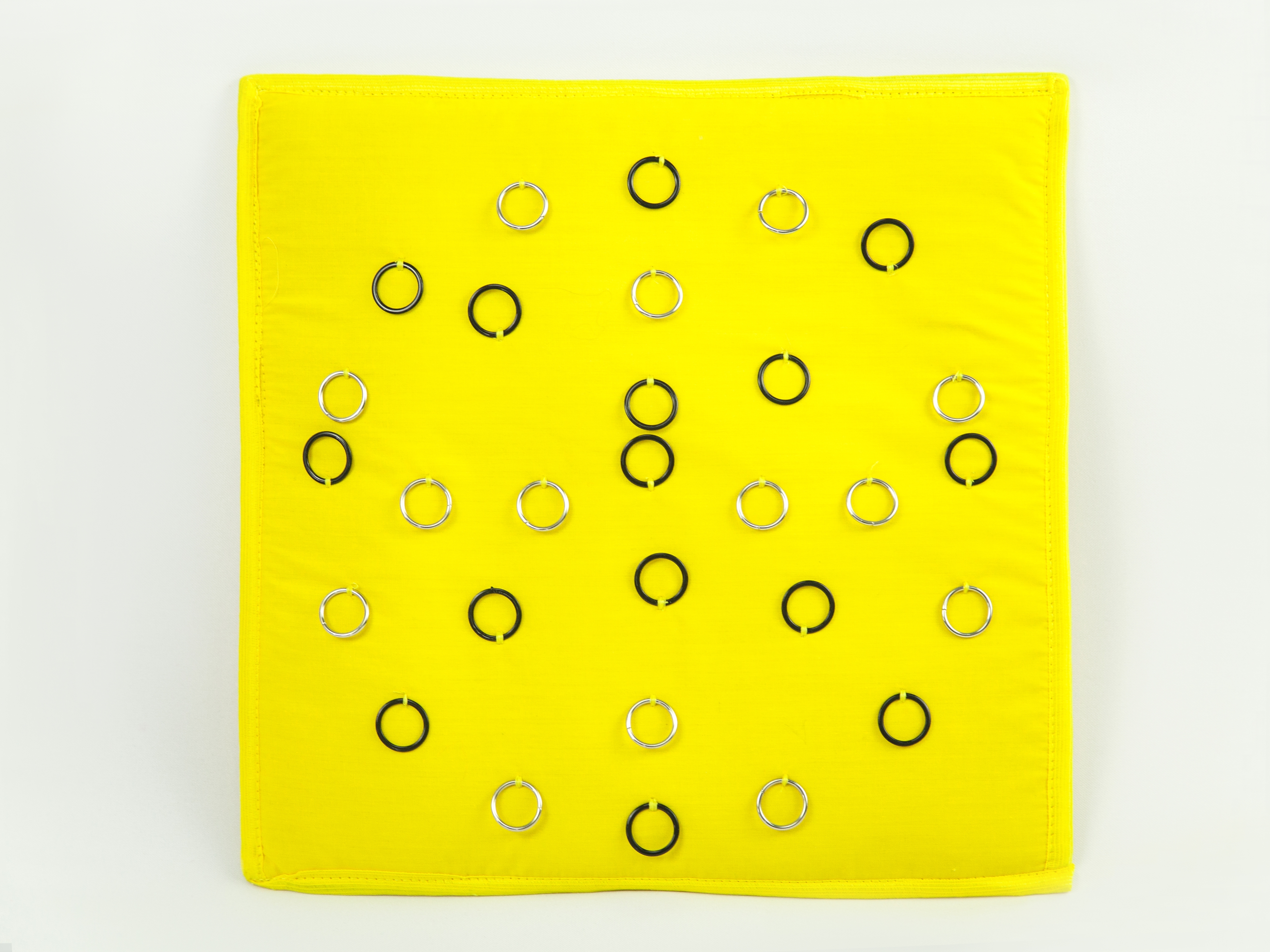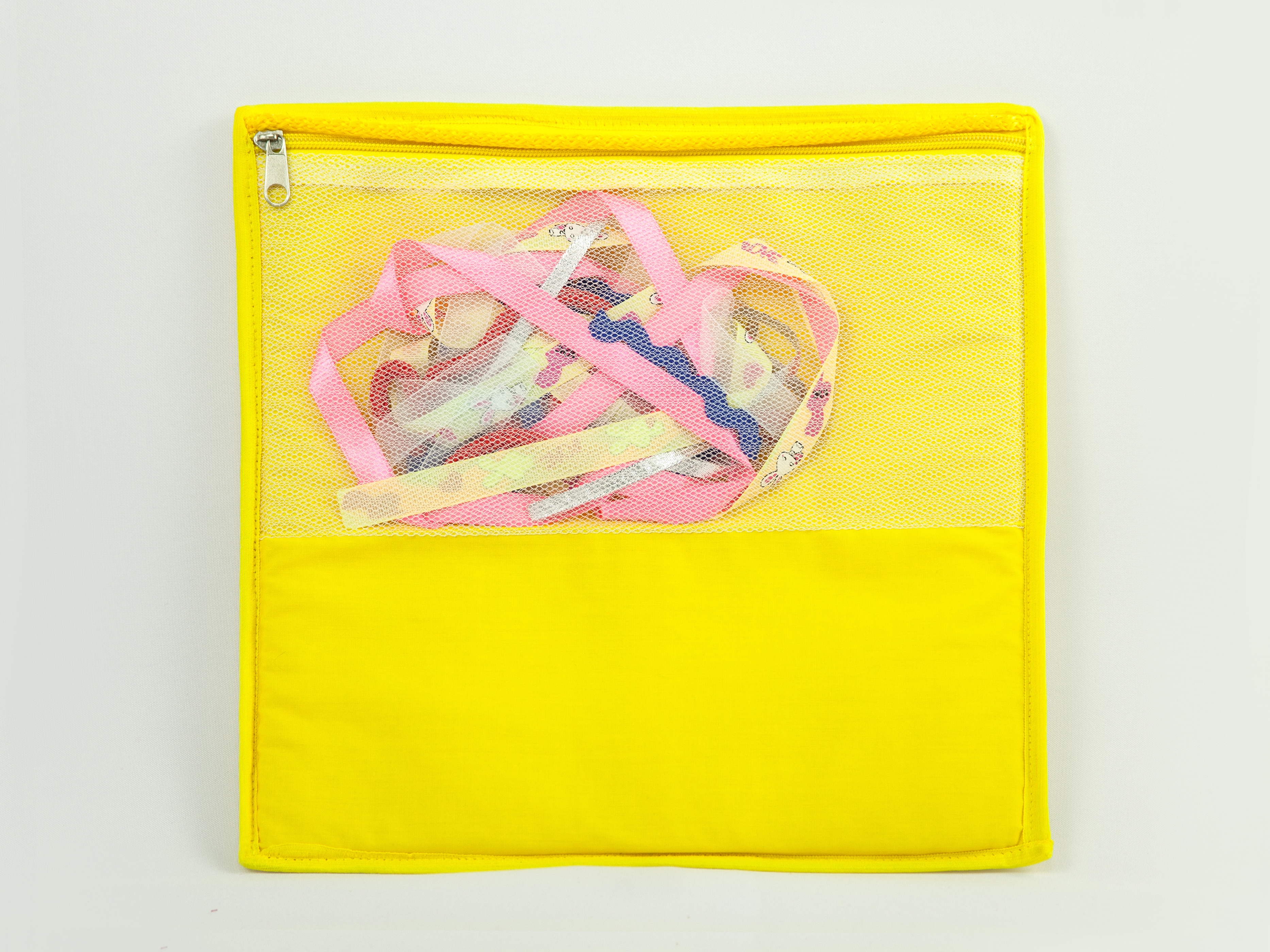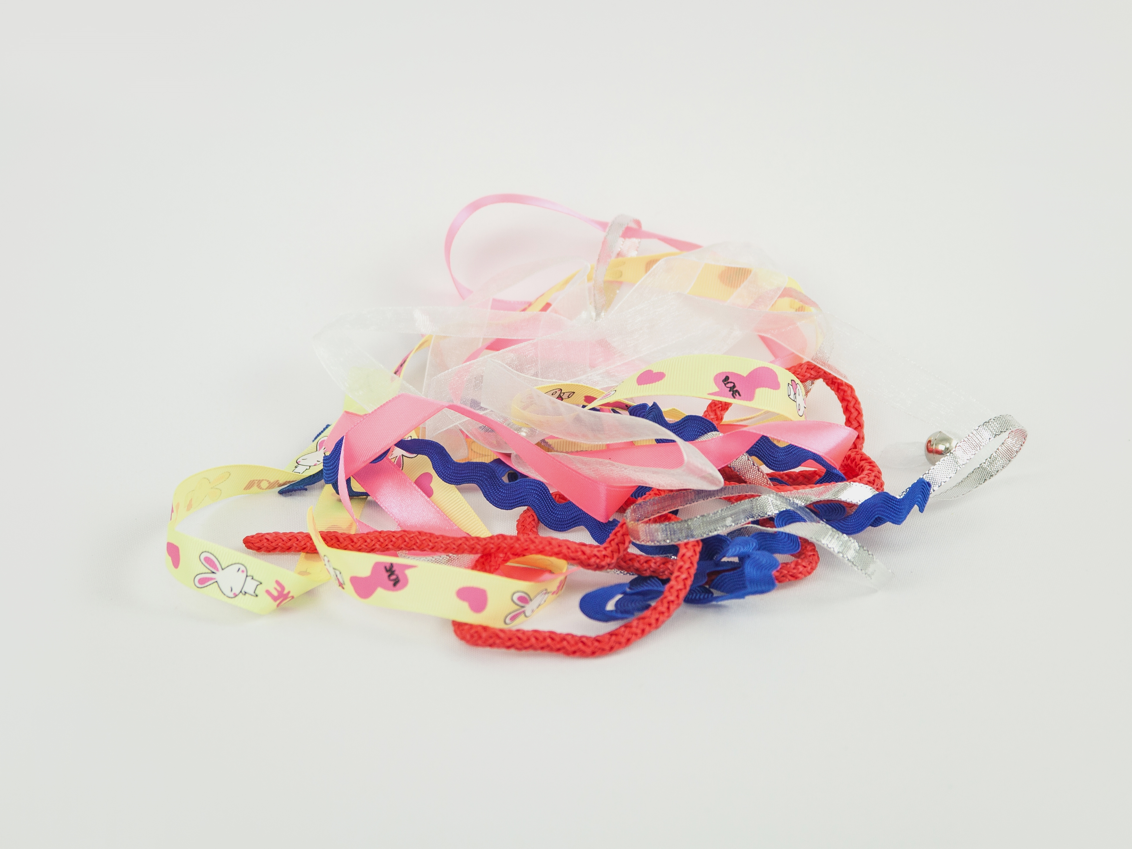 Комплектация: спереди по кругу нашиты колечки 2-х контрастных цветов диаметром 15 мм сзади 1 карман, в комплект входят: шнур, атл. лента 12 мм шириной, капроновая лента – с наконечниками, тесьма, вьюнчик, золотинка по 1,2 метра.