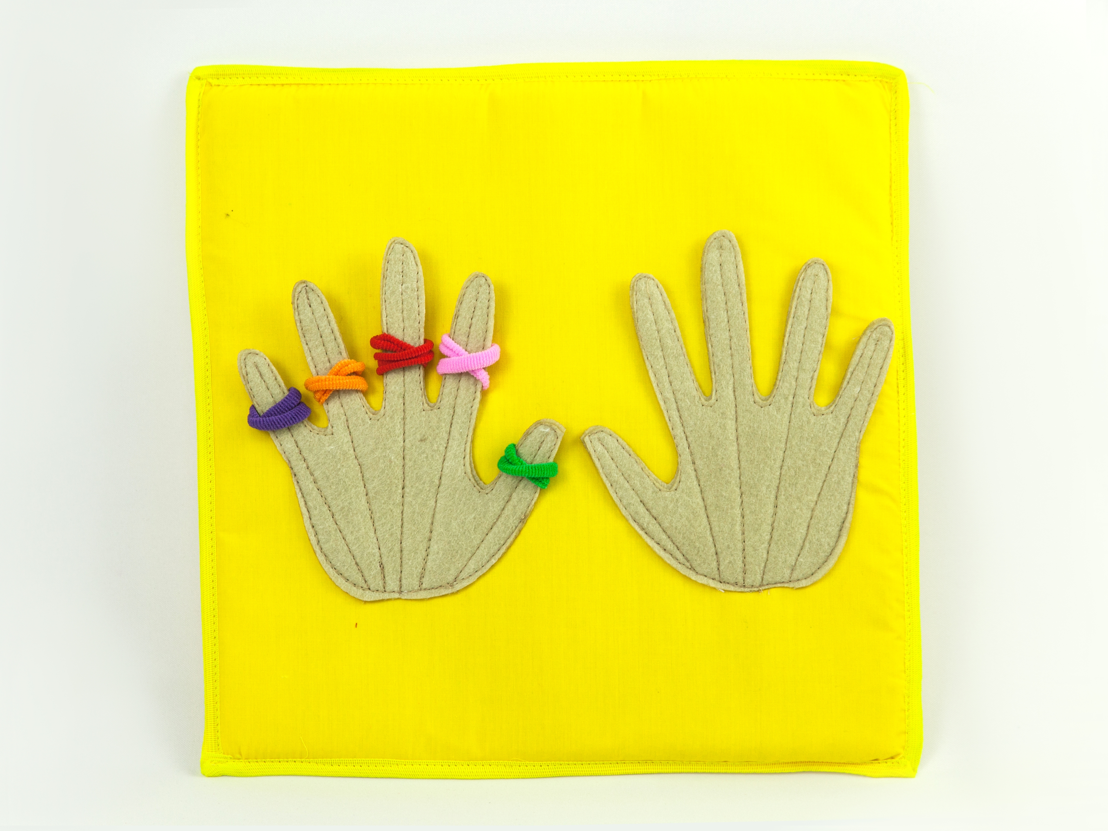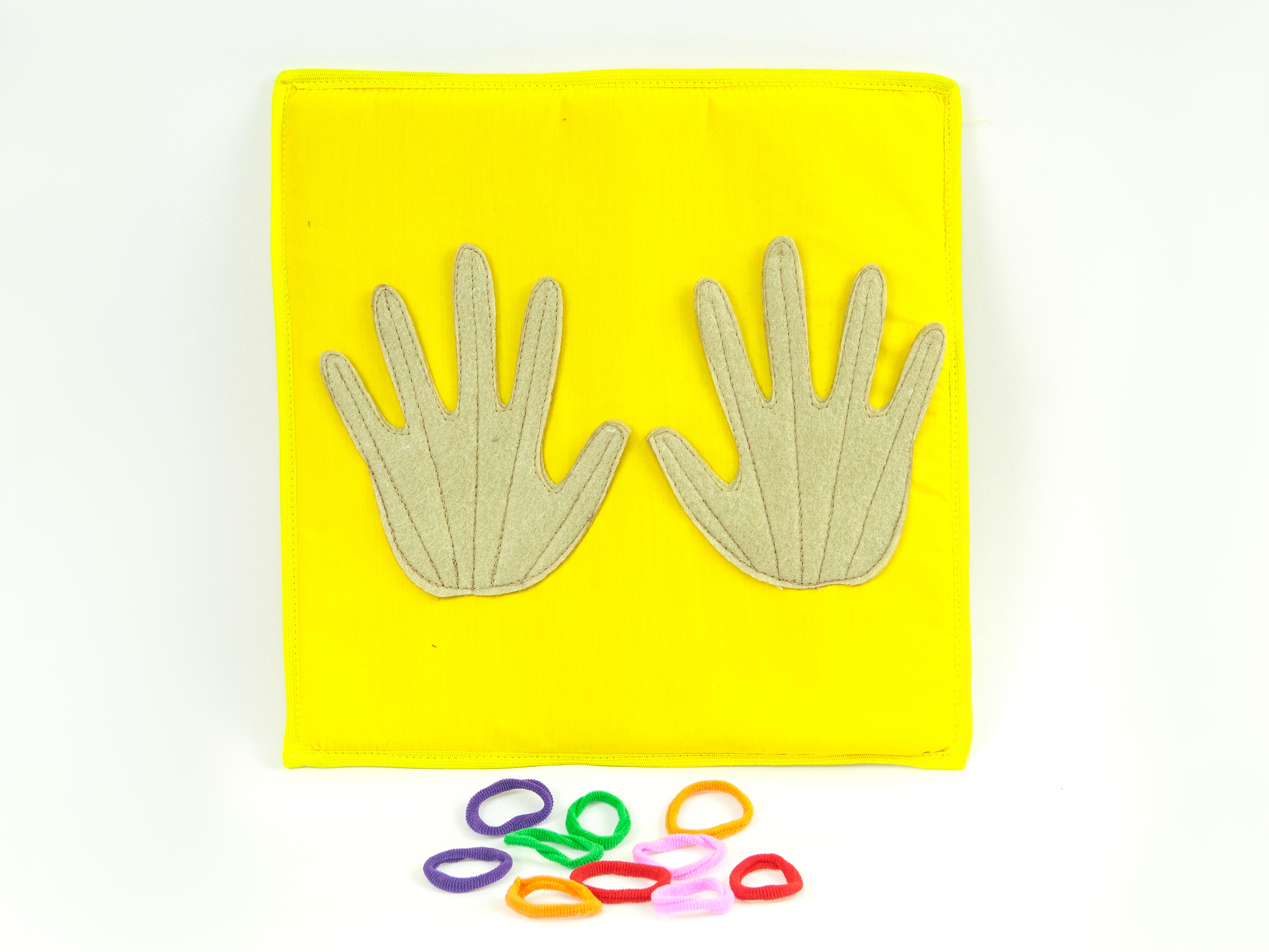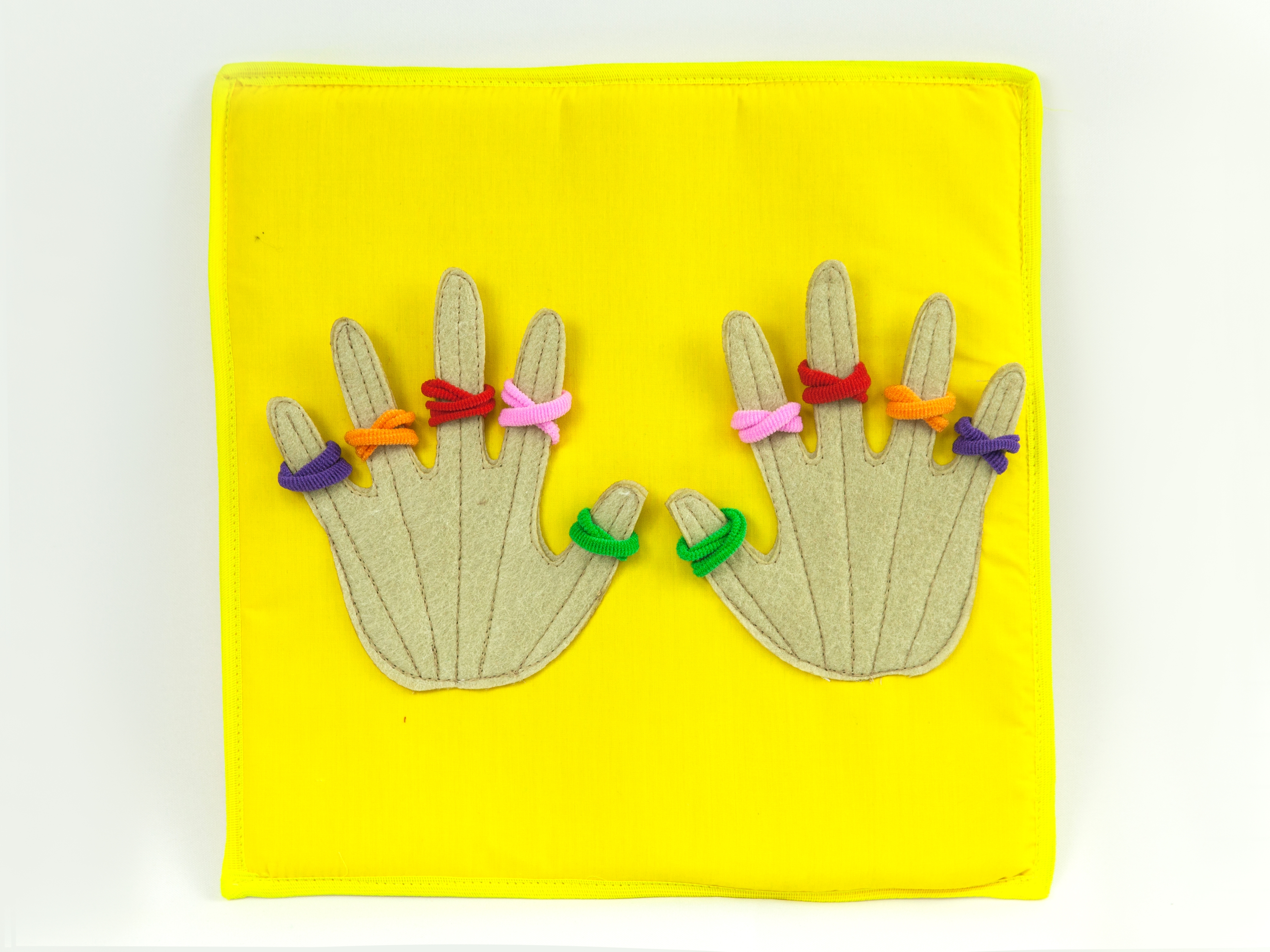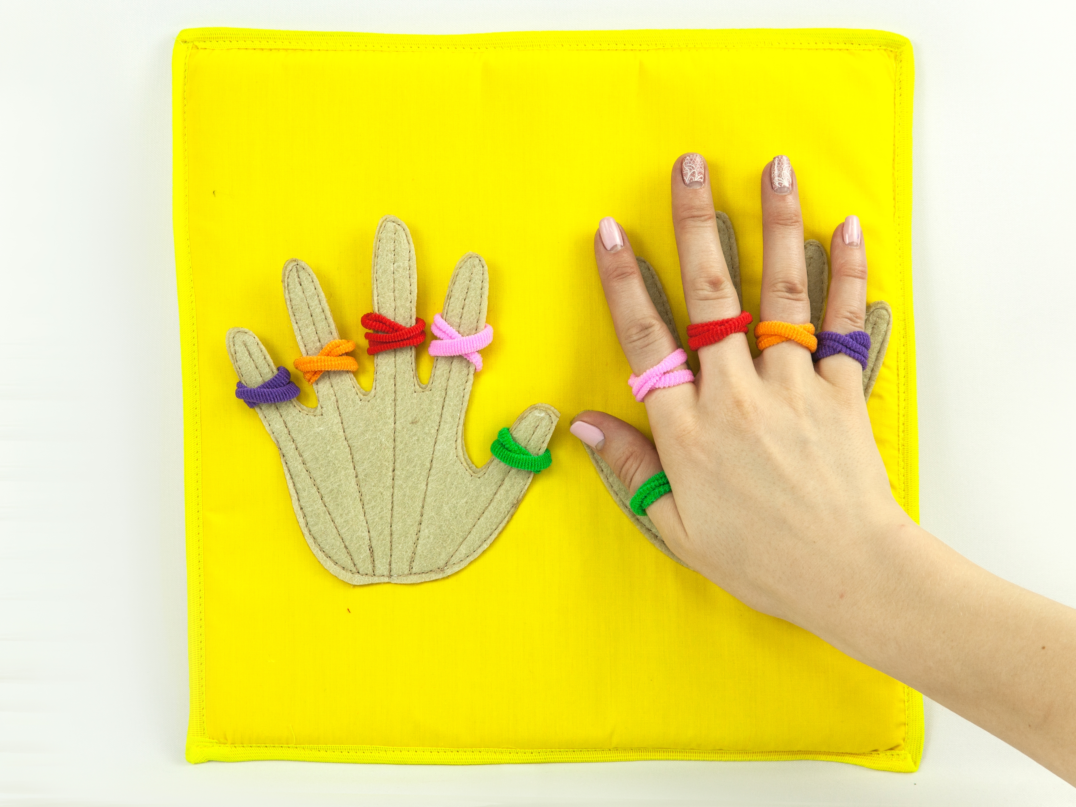 1. Ребенок учится одевать резинки на пальцы на квадрате и на пальцы на своей руке.