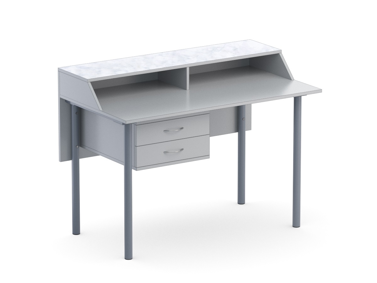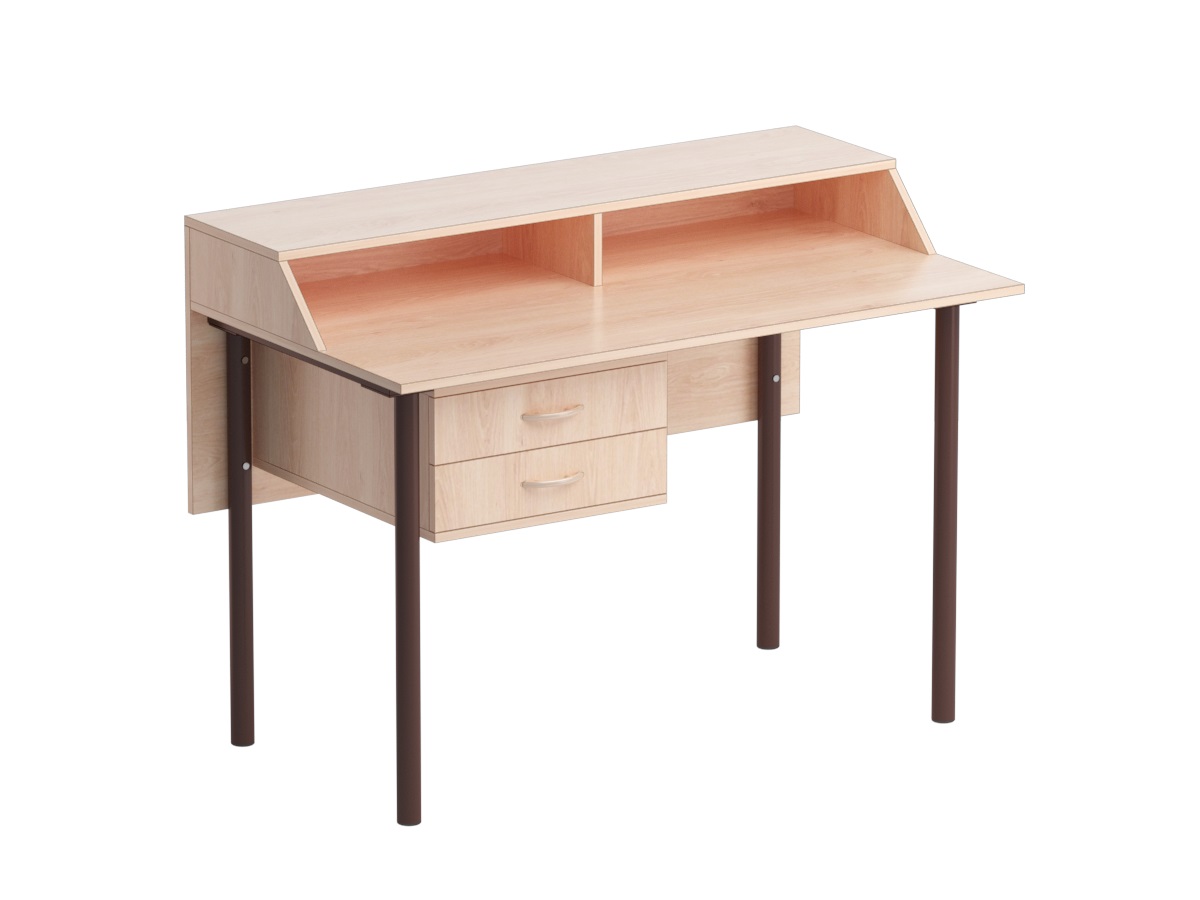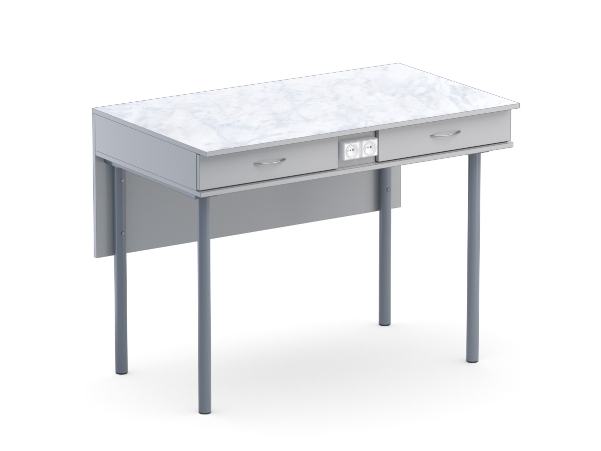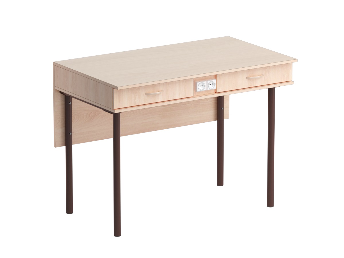 Стол  СТДкр изготавливается на каркасе круглого сечения.  Рабочая поверхность, передняя панель и два ящика, расположенные под рабочей поверхностью, выполнены из ЛДСП 16 мм, столешница облицована пластиком, торцы обрамлены кромкой ПВХ 2 мм. Стол  комплектуется двумя электрическими розетками 36…42 V. Размер:1200х700х900 мм.